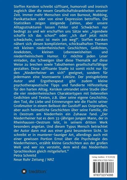 Steffen Kersken schreibt süffisant, humorvoll und ironisch zugleich über die neuen Gesellschaftskrankheiten unserer Zeit. Immer mehr Menschen sind von Burnout, Mobbing, Panikattacken oder von einer Depression betroffen. Die Statistiken zeigen steigende Zahlen, aber unsere Alltagsstrukturen lassen Fehler und Schwächen nur bedingt zu und wir erschaffen uns Sätze wie: "Irgendwie schaffe ich das schon!" oder: "Ich darf jetzt nicht schwächeln, sonst ist mein Job weg!". Steffen Kersken nähert sich diesen komplizierten, schicksalhaften Themen mit kleinen niederrheinischen Geschichten, Gedichten, Anekdoten, kleinen Lebensweisheiten und niederrheinischem Humor. Er möchte jeden Leser einladen, das Schweigen über diese Thematik auf diese Weise zu brechen sowie Tabuthemen gesellschaftsfähiger gestalten. Diese süffisante Studie ist somit nicht nur für den "Niederrheiner an sich" geeignet, sondern für jedermann eine lesenswerte Lektüre. Der preisgekrönte Autor und Ergotherapeut gibt zudem kleine psychotherapeutische Tipps und fundierte Hilfestellung für den harten Alltag. Kersken umrandet seine Studie über die vier niederrheinischen Charaktertypen mit liebevollen Gedichten und Texten, z.B. über seine eigene Geschichte, den Tod, die Liebe und Erinnerungen wie die Flucht seiner Großmutter in einem Beiboot der Gustloff aus Ostpreußen, aber auch heimatliche Geschichten über seine Familie, die in Oestrum am Niederrhein ein Zuhause fand. "Der Niederrheiner hat es dem 33-jährigen jungen Mann, der in Rheinhausen-Oestrum lebt, in seinem dritten Werk besonders angetan. Und diesen Typus Mensch betrachtet der Autor dann mal aus einer ganz besonderen Sicht. So schreibt er in munterer-launiger Art, allerdings auch mit einer gewissen Portion Ernst über die Psychologie des Niederrheiners, erzählt kleine Geschichten aus der großen Welt und wer nix versteht, dem wird das Niederrhein Sprachlexikon gleich mitgeliefert."