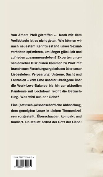 Von Amors Pfeil getroffen ... Doch mit dem Verliebtsein ist es nicht getan. Wie können wir nach neuestem Kenntnisstand unser Sexualverhalten optimieren, um länger glücklich und zufrieden zusammenzuleben? Experten unterschiedlicher Disziplinen kommen zu Wort mit brandneuen Forschungsergebnissen über unser Liebesleben. Verpaarung, Untreue, Sucht und Fantasien - vom Erbe unserer Urzeitgene über die Work-Love-Balance bis hin zur aktuellen Pandemie mit Lockdown reicht die Betrachtung. Was wird aus der Liebe? Eine (satirisch-)wissenschaftliche Abhandlung, dem geneigten Leser in sieben Themenkreisen vorgestellt. Überschaubar, kompakt und fundiert. Da staunt selbst der Gott der Liebe!