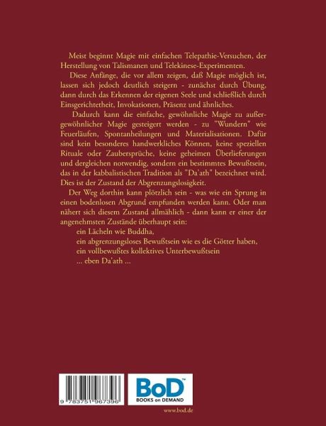 Meist beginnt Magie mit einfachen Telepathie-Versuchen, der Herstellung von Talismanen und Telekinese-Experimenten.Diese Anfänge, die vor allem zeigen, daß Magie möglich ist, lassen sich jedoch deutlich steigern - zunächst durch durch Übung, dann durch das Erkennen der eigenen Seele und schließlich durch Einsgerichtetheit, Invokationen, Präsenz und ähnliches.Dadurch kann die einfache, gewöhnliche Magie schließlich zu außergewöhnlicher Magie gesteigert werden - zu "Wundern" wie Feuerläufen, Spontanheilungen und Materialisationen. Dafür sind kein handwerkliches Können, keine speziellen Rituale oder Zaubersprüche, keine geheimen Überlieferungen und dergleichen notwendig, sondern ein bestimmtes Bewußtsein, das in der kabbalistischen Tradition als "Da'ath" bezeichnet wird. Dies ist der Zustand der Abgrenzungslosigkeit.Der Weg dorthin kann plötzlich sein - was wie in Sprung in einen bodenlosen Abgrund empfunden werden kann. Oder man nähert sich diesem Zustand allmählich - dann kann er einer der angenehmsten Zustände überhaupt sein ... ein Lächeln wie Buddha, ein abgrenzungsloses Bewußtsein wie es die Götter haben, ein vollbewußtes kollektives Unterbewußtsein ... eben Da'ath ...