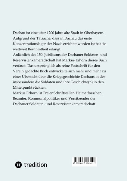 Dachau ist eine über 1200 Jahre alte Stadt in Oberbayern. Aufgrund der Tatsache, dass in Dachau das erste Konzentrationslager der Nazis errichtet worden ist hat sie weltweit Berühmtheit erlangt.Anlässlich des 150. Jubiläums der Dachauer Soldaten- und Reservistenkameradschaft hat Markus Erhorn dieses Buch verfasst. Das ursprünglich als reine Festschrift für den Verein gedachte Buch entwickelte sich mehr und mehr zu einer Übersicht über die Kriegsgeschichte Dachaus in der insbesondere die Soldaten und ihre Geschichte(n) in den Mittelpunkt rückten.Markus Erhorn ist Freier Schriftsteller, Heimatforscher, Beamter, Kommunalpolitiker und Vorsitzender der Dachauer Soldaten- und Reservistenkameradschaft.