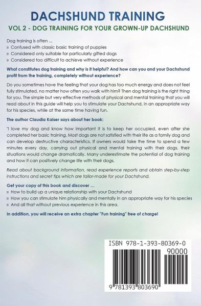 Dachshund Training Vol 2 - Dog Training for Your Grown-up Dachshund How to build up a unique relationship with your Dachshund, using training methods which are tailor-made for your Dachshund Dog training is often ...... Confused with classic basic training of puppies ... Considered only suitable for particularly gifted dogs ... Considered too difficult to achieve without experience What constitutes dog training and why is it helpful? And how can you and your Dachshund profit from the training, completely without experience? Do you sometimes have the feeling that your dog has too much energy and does not feel fully stimulated, no matter how often you walk with him? Then dog training is the right thing for you. The simple but very effective methods of physical and mental training that you will read about in this guide will help you to stimulate your Dachshund, in an appropriate way for his species, while at the same time having fun. This is volume two of the Dachshund training guides. Volume 1 for your Dachshund puppy is also available with the title "Dachshund Training: Dog Training for your Dachshund puppy". The author Claudia Kaiser says about her book: "I love my dog and know how important it is to keep her occupied, even after she completed her basic training. Most dogs are not satisfied with their life as a family dog and can develop destructive characteristics. If owners would take the time to spend a few minutes every day, carrying out physical and mental training with their dogs, their situations would change dramatically. Many underestimate the potential of dog training and how it can positively change life with their dogs." Read about background information, read experience reports and obtain step-by-step instructions and secret tips which are tailor-made for your Dachshund. Get your copy of this book and discover...... How to build up a unique relationship with your Dachshund ... How you can stimulate him physically and mentally in an appropriate way for his species ... And all that without previous experience in this area. In addition, you will receive an extra chapter "Fun training" free of charge! Content of this book:About the Author Preface What is dog training? Why is dog training useful for your adult Dachshund? What should you pay particular attention to? What is particularly important for your Dachshund? What to watch out for? What does your Dachshund need to know already? Physical Training What is physical training? What are the advantages? Introduction of the training methods Intelligence Training What is intelligence training? What are the advantages? Is your dog intelligent? Introduction of the training methods Special Chapter: Fun Training What is fun training? What are the advantages? Introducing the training methods Excursus: Clicker Training What is Clicker Training? What are the advantages? Frequently asked questions Introduction of the training methods Summary of training methods Types of Dog Sports Things to avoid at all costs The next steps Conclusion