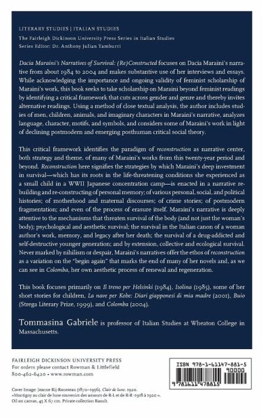 Dacia Maraini’s Narratives of Survival: (Re)Constructed explores key narratives published between1984 and 2004 through an elaboration of the paradigm of reconstruction. Using close textual analysis and interviews and essays by Maraini, the author includes men, children, animals, and imaginary characters in her study. The text explores language, character, motifs, and symbols and considers Maraini’s work in light of her reputation as a feminist writer and of declining postmodern and emerging posthuman critical social theories.