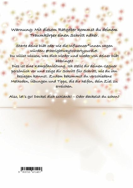 Warnung: Mit diesem Ratgeber kommst du deinem Traumkörper einen Schritt näher.Starte deine Diät oder wie die Influencer_innen sagen würden: #therightwaytostartyourdiet.Du willst wissen, was dich wieder und wieder von deiner Diät abbringt?Dies ist eine Kampfanleitung. Ich stelle dir deinen Gegner persönlich vor und zeige dir Schritt für Schritt, wie du ihn besiegen kannst. Zudem bekommst du verschiedene Methoden, Übungen und Tipps, die dir helfen, dein Ziel zu erreichen.Dackel dich schlank! Oder dackelst du schon?
