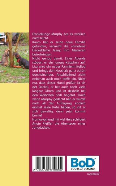 Dackeljunge Murphy hat es wirklich nicht leicht.Kaum hat er seine neue Familie gefunden, versucht die vornehme Dackeldame Jeany, ihm Manieren beizubringen.Nicht genug damit. Eines Abends stöbert er ein junges Kätzchen auf. Lisa wird ein neues Familienmitglied und bringt den Haushalt ganz schön durcheinander. Anschließend zieht nebenan auch noch Idefix ein. Nicht nur, dass dieser Hund größer ist als der Dackel, er hat auch noch viele längere Ohren und ist deshalb bei den Weibchen heiß begehrt. Doch wenn Murphy gedacht hat, er würde nach all der Aufregung endlich einmal seine Ruhe haben, so irrt er sich gewaltig, denn jetzt kommt Emma!Humorvoll und mit viel Herz schildert Angie Pfeiffer die Abenteuer eines Jungdackels.