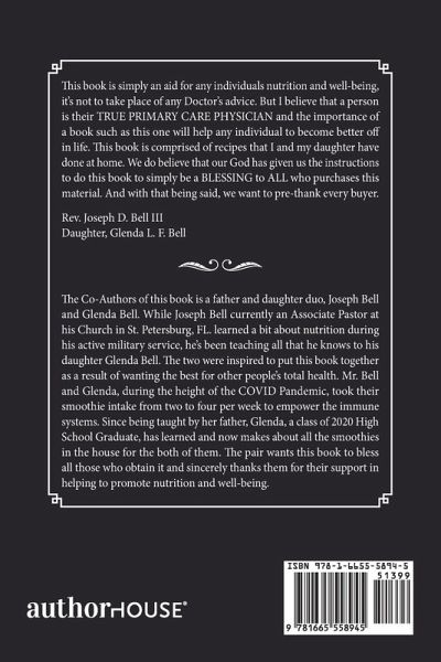 This book is simply an aid for any individuals nutrition and well-being, it's not to take place of any Doctor's advice. But I believe that a person is their TRUE PRIMARY CARE PHYSICIAN and the importance of a book such as this one will help any individual to become better off in life. This book is comprised of recipes that I and my daughter have done at home. We do believe that our God has given us the instructions to do this book to simply be a BLESSING to ALL who purchases this material. And with that being said, we want to pre-thank every buyer. Rev. Joseph D. Bell III Daughter, Glenda L. F. Bell