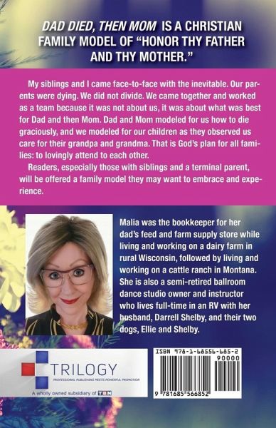 Dad Died, Then Mom is a Christian family model of "Honor thy father and thy mother." My siblings and I came face-to-face with the inevitable. Our parents were dying. We did not divide. We came together and worked as a team because it was not about us, it was about what was best for Dad and then Mom. Dad and Mom modeled for us how to die graciously, and we modeled for our children as they observed us care for their grandpa and grandma. That is God's plan for all families: to lovingly attend to each other. Readers, especially those with siblings and a terminal parent, will be offered a family model they may want to embrace and experience.