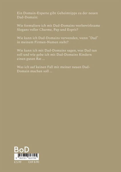 Ein Domain-Experte gibt Geheimtipps zu der neuen Dad-Domain:Wie formuliere ich mit Dad-Domains werbewirksame Slogans voller Charme, Pep und Esprit?Wie kann ich Dad-Domains verwenden, wenn "Dad" in meinem Firmen-Namen steht?Wie kann ich mit Dad-Domains sagen, was Dad tun soll und wie gebe ich mit Dad-Domains Kindern einen guten Rat ...Was ich auf keinen Fall mit meiner neuen Dad-Domain machen soll ...