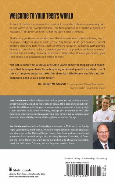 Listen Up, Dads! Your Teen Is Talking to You! As exasperating as parenting can be during these volatile years, your teen is depending on you for steady faithfulness, love, and guidance. And because teens often find words elusive and expression difficult, they probably haven't told you the things they wish you somehow automatically knew. So let Dad, If You Only Knew... be your guide. Josh Weidmann, just out of the teen years himself, joins his father, James, to help dads understand where their kids are coming from. It's a messy world they live in, and meeting them in it is no simple task. But knowing these essentials now makes fatherhood eight times easier! Welcome to Your Teen's World It doesn't matter if you have the most picture-perfect, ideal-in-every-way teen or one who's in full-swing rebellion. That teen you love is a "riddle wrapped in a mystery." No father can know what his teen is really thinking. That's why youth communicator Josh Weidmann teamed with his father, Jim, to help you bridge the gap. In Dad, If You Only Knew…you'll get an open, honest glimpse inside the teen mind. Josh's extensive research, combined with pointed direction from a father's heart, provide you with the practical guidance you need to establish a healthy, thriving father-teen relationship. It's one you desire, your teen needs, and you both can't afford to miss. Story Behind the Book "The resounding cry of teens for their fathers rings in my ear. I have been speaking to youth for five years and the greatest void I see in teens' lives is the one left by their dad. I am only twenty-three years old myself, and to this day I can say that my dad is the most influential man in my life. Because of his impact, I have asked him share in this book. We have written this message in hopes of helping dads reengage in the vital father-teen relationship." -Josh Weidmann