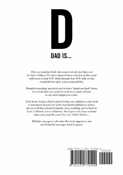 This is a book for Dads who want to do the best they can for their children. It's not a manual but a selection of ideas and reflections to help YOU think through how YOU take on this wonderful but often scary responsibility. Thought-provoking, practical and at times 'laugh-out loud' funny, it's a book that can easily be read in a couple of hours or one short chapter at a time. At its heart, being a Dad is about loving your children so this book is structured around one of the best known definitions of love, one you will have heard at nearly every wedding you've been to: Love is Patient, Love is Kind etc. But it gets a lot closer to home when you swap the word 'Love' for 'Dad'! Dad is... Whether you agree with what this book suggests or not, you'll find the messages hard to ignore.