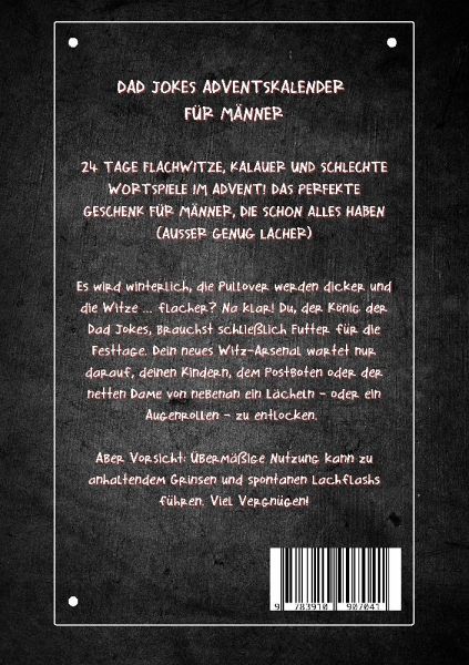 Endlich ist er da! Der Adventskalender, auf den niemand gewartet hat, den aber jeder braucht: Der Dad Jokes Adventskalender! Dieser etwas andere Adventskalender verkürzt die Wartezeit bis Weihnachten mit einer Menge Flachwitzen, Kalauern und schlechten Wortspielen. Genau das richtige für jeden mit dem legendären Väter-Humor.