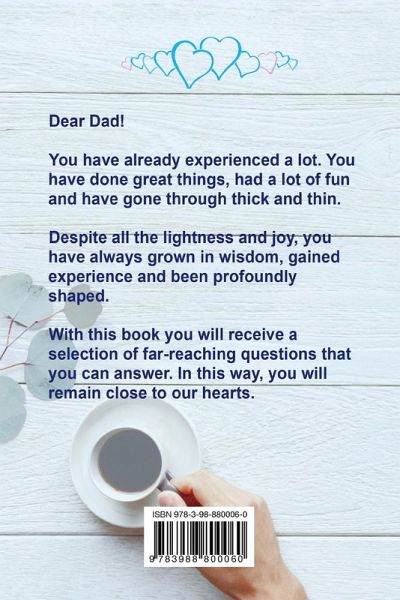 An extraordinary personal and creative gift for Christmas, marriage anniversary, birthday or Father's Day. Your dad has experienced a lot. He did wonderful things, had fun, and went through thick and thin. Through it all-the ease, joy, and challenges-he has gained wisdom, gathered experiences, and been deeply shaped. These experiences and lessons from your dad's life are a valuable treasure of memories for you. Yet, there are still many things your dad has not told you. Unique, creative, and unforgettable: - Your dad receives 140 profound questions to record the most beautiful and emotional moments of his life for you - An extraordinary personal and creative gift for Christmas, wedding anniversary, birthday, or Father's Day - Artful pictures highlight the individual questions - You gain valuable wisdom and advice from your dad's rich experiences - Wonderful stories create an unforgettable memory of dad Inspiring questions include: 1. How did you meet Mom and decide to marry? 2. Which moments in life make you especially happy to remember? 3. How did you overcome difficulties and challenges? 4. What goals and dreams do you hold for the future? 5. What brings you joy? . . . And many more Your dad has likely never received such a personal gift before. Make his eyes light up, discover new facets of his life, and deepen your father-child bond. Order your copy now and make both you and your dad very happy with this special gift book!
