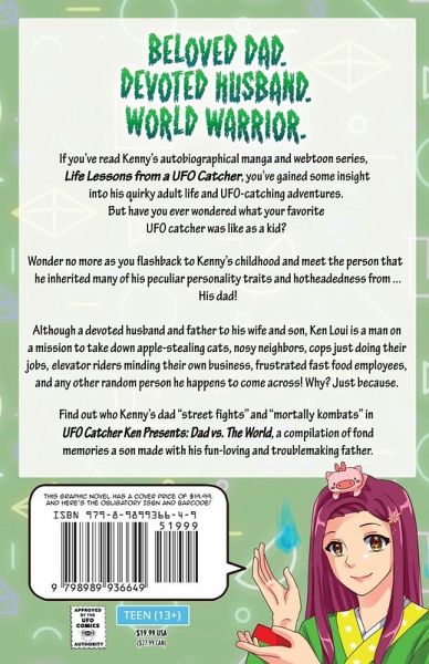 BELOVED DAD. DEVOTED HUSBAND. WORLD WARRIOR. If you've read Kenny's autobiographical manga and webtoon series, Life Lessons from a UFO Catcher, you've gained some insight into his quirky adult life and UFO-catching adventures. But have you ever wondered what your favorite UFO catcher was like as a kid? Wonder no more as you flashback to Kenny's childhood and meet the person that he inherited many of his peculiar personality traits and hotheadedness from... his dad! Although a devoted husband and father to his wife and son, Ken Loui is a man on a mission to take down apple-stealing cats, nosy neighbors, cops just doing their jobs, elevator riders minding their own business, frustrated fast food employees, and any other random person he happens to come across! Why? Just because. Find out who Kenny's dad "street fights" and "mortally kombats" in UFO Catcher Ken Presents: Dad vs. The World, a compilation of fond memories a son made with his fun-loving and troublemaking father.