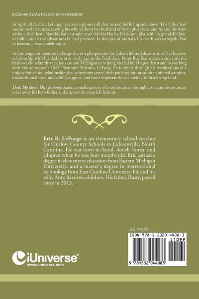 In April 2013, Eric LeFurge received a phone call that turned his life upside down. His father had succumbed to cancer, leaving his wife without her husband of forty-plus years, and he and his sister without their hero. Now his father would never ride his Harley-Davidson, play with his grandchildren, or fulfill any of the adventures he had planned. In the eyes of mortals, his death was a tragedy. But in heaven, it was a celebration. In this poignant memoir, LeFurge shares a glimpse into his fathers life and dreams as well as his own relationship with his dad from an early age to the final days. From Boy Scout excursions into the back woods to family vacations around Michigan to helping his dad build a pole barn and to working with him to restore a 1981 Plymouth Turismo, LeFurge leads others through his recollections of a unique father-son relationship that sometimes tested their patience but most often offered comfort, unconditional love, unyielding support, and most importantly, a shared faith in a loving God. Dad: My Hero, Our Journey shares a touching story of a sons journey through his memories as cancer takes away his hero father and inspires the ones left behind.