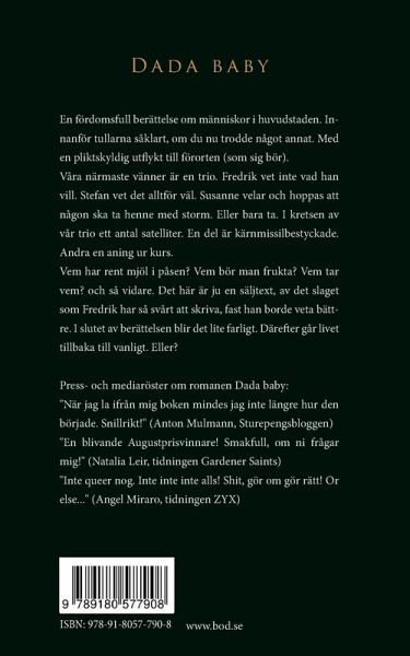 En fördomsfull berättelse om de unga och vackra i huvudstaden. Innanför tullarna såklart, om nu någon trodde något annat. Med en pliktskyldig utflykt till förorten - för att blidka den kräsna publiken. Våra närmaste vänner är en trio. Fredrik vet inte vad han vill. Stefan vet det alltför väl. Susanne velar och hoppas på att någon ska ta henne med storm. Eller bara ta. I kretsen av vår trio finns ett antal satelliter. En del är kärnmissilbestyckade. Andra bara en aning ur kurs. Vem har rent mjöl i påsen? Vem är farlig? Vem tar vem? och så vidare. Det här är ju en säljtext, av det slaget som Fredrik har så svårt att skriva, fast han borde veta bättre. I slutet av berättelsen blir det lite farligt, varpå livet går tillbaka till vanligt. Eller gör det det? Press- och mediaröster om romanen Dada baby: "När jag la ifrån mig boken mindes jag inte längre hur den började. Snillrikt!" (Anton Mulmann, Sturepengsbloggen) "En blivande Augustprisvinnare! Smakfull, om ni frågar mig!" (Natalia Leir, tidningen Gardener Saints) "Inte queer nog. Inte inte inte alls! Shit, gör om gör rätt! Or else..." (Angel Miraro, tidningen ZYX)