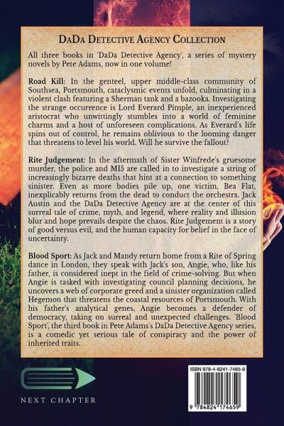 All three books in 'DaDa Detective Agency', a series of mystery novels by Pete Adams, now in one volume! Road Kill: In the genteel, upper middle-class community of Southsea, Portsmouth, cataclysmic events unfold, culminating in a violent clash featuring a Sherman tank and a bazooka. Investigating the strange occurrence is Lord Everard Pimple, an inexperienced aristocrat who unwittingly stumbles into a world of feminine charms and a host of unforeseen complications. As Everard's life spins out of control, he remains oblivious to the looming danger that threatens to level his world. Will he survive the fallout? Rite Judgement: In the aftermath of Sister Winfrede's gruesome murder, the police and MI5 are called in to investigate a string of increasingly bizarre deaths that hint at a connection to something sinister. Even as more bodies pile up, one victim, Bea Flat, inexplicably returns from the dead to conduct the orchestra. Jack Austin and the DaDa Detective Agency are at the center of this surreal tale of crime, myth, and legend, where reality and illusion blur and hope prevails despite the chaos. Rite Judgement is a story of good versus evil, and the human capacity for belief in the face of uncertainty. Blood Sport: As Jack and Mandy return home from a Rite of Spring dance in London, they speak with Jack's son, Angie, who, like his father, is considered inept in the field of crime-solving. But when Angie is tasked with investigating council planning decisions, he uncovers a web of corporate greed and a sinister organization called Hegemon that threatens the coastal resources of Portsmouth. With his father's analytical genes, Angie becomes a defender of democracy, taking on surreal and unexpected challenges. 'Blood Sport', the third book in Pete Adams's DaDa Detective Agency series, is a comedic yet serious tale of conspiracy and the power of inherited traits.