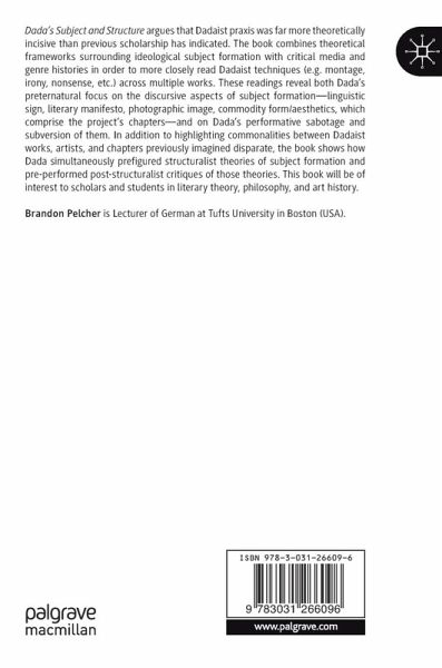 Dada's Subject and Structure argues that Dadaist praxis was far more theoretically incisive than previous scholarship has indicated. The book combines theoretical frameworks surrounding ideological subject formation with critical media and genre histories in order to more closely read Dadaist techniques (e.g. montage, irony, nonsense, etc.) across multiple works. These readings reveal both Dada's preternatural focus on the discursive aspects of subject formation-linguistic sign, literary manifesto, photographic image, commodity form/aesthetics, which comprise the project's chapters-and on Dada's performative sabotage and subversion of them. In addition to highlighting commonalities between Dadaist works, artists, and chapters previously imagined disparate, the book shows how Dada simultaneously prefigured structuralist theories of subject formation and pre-performed post-structuralist critiques of those theories.