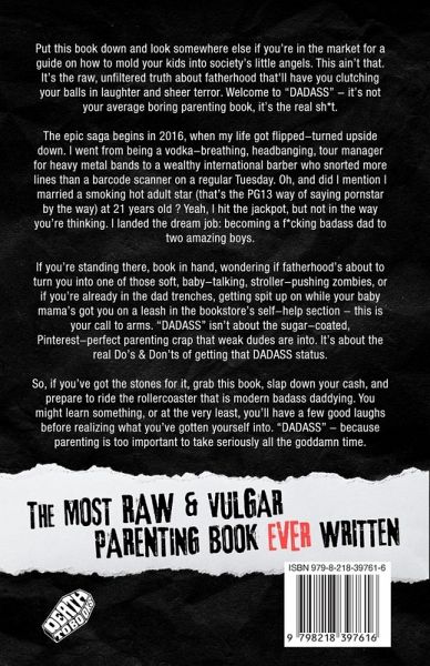 Put this book down and look somewhere else if you're in the market for a guide on how to mold your kids into society's little angels. This ain't that. It's the raw, unfiltered truth about fatherhood that'll have you clutching your balls in laughter and sheer terror. Welcome to "DADASS" - it's not your average boring parenting book, it's the real shit. The epic saga begins in 2016, when my life got flipped-turned upside down. I went from being a vodka-breathing, headbanging, tour manager for heavy metal bands to a wealthy international barber who snorted more lines than a barcode scanner on a regular Tuesday. Oh, and did I mention I married a smoking hot adult star (that's the PG13 way of saying pornstar by the way) at 21 years old ? Yeah, I hit the jackpot, but not in the way you're thinking. I landed the dream job: becoming a f*cking badass dad to two amazing boys. If you're standing there, book in hand, wondering if fatherhood's about to turn you into one of those soft, baby-talking, stroller-pushing zombies, or if you're already in the dad trenches, getting spit up on while your baby mama's got you on a leash in the bookstore's self-help section - this is your call to arms. "DADASS" isn't about the sugar-coated, Pinterest-perfect parenting crap that weak dudes are into. It's about the real Do's & Don'ts of getting that DADASS status. So, if you've got the stones for it, grab this book, slap down your cash, and prepare to ride the rollercoaster that is modern badass daddying. You might learn something, or at the very least, you'll have a few good laughs before realizing what you've gotten yourself into. "DADASS" - because parenting is too important to take seriously all the goddamn time.