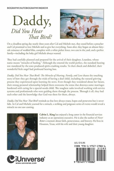 On a cloudless spring day nearly three years after Cal and Michele met, they stood before a preacher and Cal promised to love Michele and to give her everything. Soon after, they began an almost fairy-tale existence of wedded bliss, complete with a white picket fence, two cats in the yard, and a perfect family-including the baby girl Michele always wanted. They had carefully planned and prepared for the arrival of their daughter, Lourdess, whose name means "miracles of healing." Although she entered the world perfect, the standard hearing test mandated by the state produced spirit-crushing results. To their shock and disbelief, their wonderful little angel had profound hearing loss. Daddy, Did You Hear That Bird?: The Miracles of Hearing, Family, and Love shares the touching story of how they got through the trials of having a deaf child, including the natural grieving process they experienced upon learning the news. Even though they wondered about her future, their strong personal relationship helped them overcome the stress that destroys some marriages burdened with caring for a special-needs child. The toughest tasks involved working with service systems and professionals who were guiding them through the process. Through it all, they had each other and the knowledge that God was there for them, always. Daddy, Did You Hear That Bird? reminds us that love always trusts, hopes and perseveres but it never fails. As Cal and Michele yearned for a miracle, a striking and poignant series of events would reveal a miracle no one saw coming.
