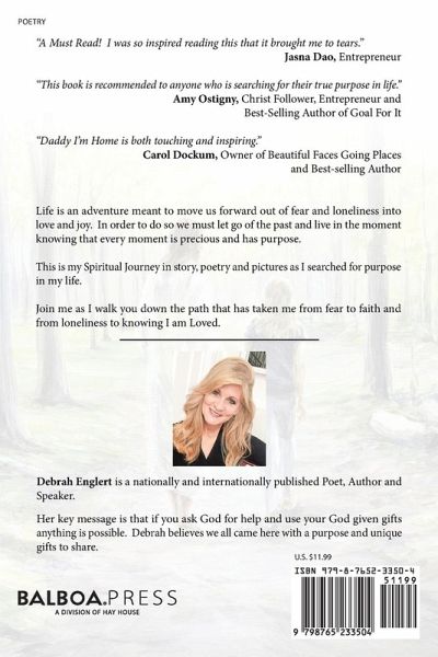 "A Must Read! I was so inspired reading this that it brought me to tears." Jasna Dao, Entrepreneur "This book is recommended to anyone who is searching for their true purpose in life." Amy Ostigny, Christ Follower, Entrepreneur and Best-Selling Author of Goal For It "Daddy I'm Home is both touching and inspiring." Carol Dockum, Owner of Beautiful Faces Going Places and Best-selling Author Life is an adventure meant to move us forward out of fear and loneliness into love and joy. In order to do so we must let go of the past and live in the moment knowing that every moment is precious and has purpose. This is my Spiritual Journey in story, poetry and pictures as I searched for purpose in my life. Join me as I walk you down the path that has taken me from fear to faith and from loneliness to knowing I am Loved.
