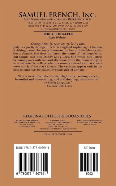 Comedy / 6m, 1f, 6c or 4m, 4f, 3c / 4 ints. Judy is a pretty drudge in a New England orphanage. One day a visiting trustee becomes interested in her and decides to give her a chance. She does not know the name of her benefactor, but simply calls him Daddy Long Legs. She writes him letters brimming over with fun and affection. From the home she goes to a fashionable college where a romance develops that constitutes much of the play's charm. The orphans appear only in the first act and may be pl