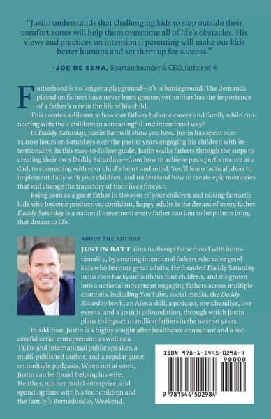 Fatherhood is no longer a playground—it’s a battleground. The demands placed on fathers have never been greater, yet neither has the importance of a father’s role in the life of his child. This creates a dilemma: how can fathers balance career and family while connecting with their children in a meaningful and intentional way? In Daddy Saturday, Justin Batt will show you how. Justin has spent over 13,000 hours on Saturdays over the past 11 years engaging his children with intentionality. In this easy-to-follow guide, Justin walks fathers through the steps to creating their own Daddy Saturdays—from how to achieve peak performance as a dad, to connecting with your child’s heart and mind. You’ll learn tactical ideas to implement daily with your children, and understand how to create epic memories that will change the trajectory of their lives forever. Being seen as a great father in the eyes of your children and raising fantastic kids who become productive, confident, happy adults is the dream of every father. Daddy Saturday is a national movement every father can join to help them bring that dream to life.