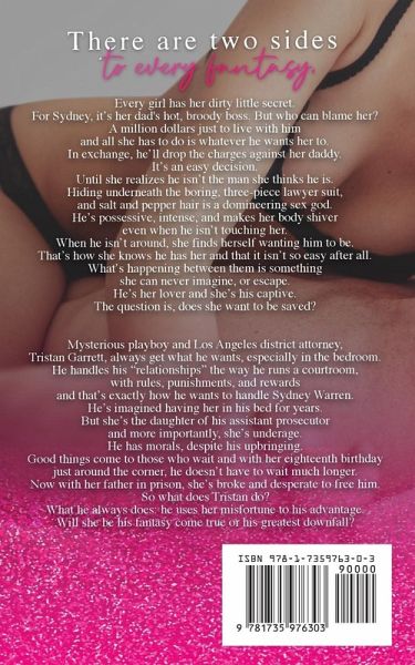 There are two sides to every fantasy. Her side Every girl has her dirty little secret. For Sydney, it's her dad's hot, broody boss. But who can blame her? A million dollars just to live with him and all she has to do is whatever he wants her to. In exchange, he'll drop the charges against her daddy. It's an easy decision. Until she realizes he isn't the man she thinks he is. Hiding underneath the boring, three-piece lawyer suit, and salt and pepper hair is a domineering sex god. He's possessive, intense, and makes her body shiver even when he isn't touching her. When he isn't around, she finds herself wanting him to be. That's how she knows he has her and that it isn't so easy after all. What's happening between them is something she can never imagine, or escape. He's her lover and she's his captive. The question is, does she want to be saved? His side Mysterious playboy and Los Angeles district attorney, Tristan Garrett, always get what he wants, especially in the bedroom. He handles his "relationships" the way he runs a courtroom, with rules, punishments, and rewards and that's exactly how he wants to handle Sydney Warren. He's imagined having her in his bed for years. But she's the daughter of his assistant prosecutor and more importantly, she's underage. He has morals, despite his upbringing. Good things come to those who wait and with her eighteenth birthday just around the corner, he doesn't have to wait much longer. Now with her father in prison, she's broke and desperate to free him. So what does Tristan do? What he always does: he uses her misfortune to his advantage. Will she be his fantasy come true or his greatest downfall? If you like age-gap, captive romance then read Daddy's Girl. Readers with daddy issues may want to skip this one.