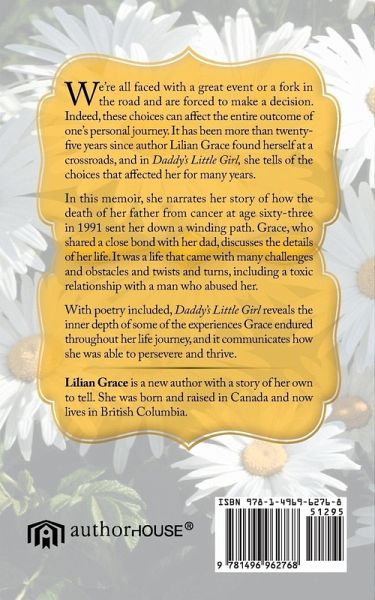 We're all faced with a great event or a fork in the road and are forced to make a decision. Indeed, these choices can affect the entire outcome of one's personal journey. It has been more than twenty five years since author Lilian Grace found herself at a crossroads, and in Daddy's Little Girl, she tells of the choices that affected her for many years. In this memoir, she narrates her story of how the death of her father from cancer at age sixty-three in 1991 sent her down a winding path. Grace, who shared a close bond with her dad, discusses the details of her life. It was a life that came with many challenges and obstacles and twists and turns, including a toxic relationship with a man who abused her. With poetry included, Daddy's Little Girl reveals the inner depth of some of the experiences Grace endured throughout her life journey, and it communicates how she was able to persevere and thrive.