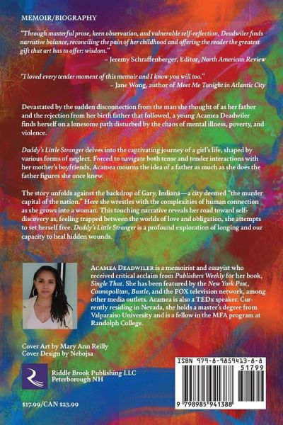 Devastated by the sudden disconnection from the man she thought of as her father, and the rejection from her birth father that followed, a young Acamea Deadwiler finds herself on a lonesome path disturbed by the chaos of mental illness, poverty, and violence. Daddy's Little Stranger delves into the captivating journey of a girl's life, shaped by various forms of neglect. Forced to navigate both tense and tender interactions with her mother's boyfriends, Acamea mourns the idea of a father as much as she does the father figures she once knew. She arms herself with resentment and emotional distance for protection. Acamea tells her story set against the backdrop of Gary, Indiana-a city deemed "the murder capital of the nation." Here she wrestles with the complexities of human connection as she grows into a woman. This touching narrative reveals her road toward self-discovery as, feeling trapped between the worlds of love and obligation, she attempts to set herself free. Daddy's Little Stranger is a profound exploration of longing and our capacity to heal hidden wounds.