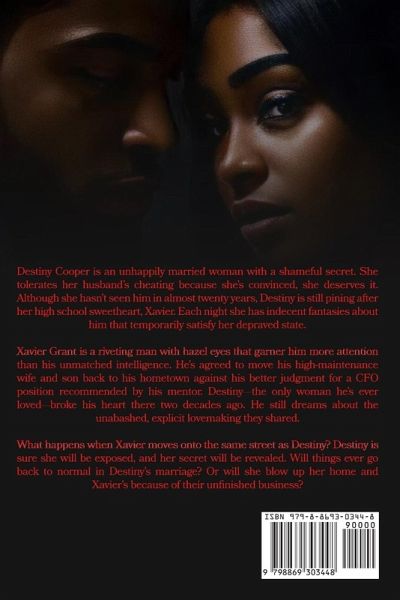 Destiny Cooper is an unhappily married woman with a shameful secret. She tolerates her husband's cheating because she's convinced, she deserves it. Although she hasn't seen him in almost twenty years, Destiny is still pining after her high school sweetheart, Xavier. Each night she has indecent fantasies about him that temporarily satisfy her depraved state. Xavier Grant is a riveting man with hazel eyes that garner him more attention than his unmatched intelligence. He's agreed to move his high-maintenance wife and son back to his hometown against his better judgment for a CFO position recommended by his mentor. Destiny-the only woman he's ever loved-broke his heart there two decades ago. He still dreams about the unabashed, explicit lovemaking they shared. What happens when Xavier moves onto the same street as Destiny? Destiny is sure she will be exposed, and her secret will be revealed. Will things ever go back to normal in Destiny's marriage? Or will she blow up her home and Xavier's because of their unfinished business?