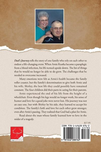 Dad's Journey tells the story of one family who rely on each other to endure a life-changing event. When Arnie Kustka became a paraplegic from a blood infection, his life turned upside down. The list of things that he would no longer be able to do grew. The challenges that he needed to overcome increased. Many emotions were felt as Arnie's health became the family roller coaster, but the family's determination to give both Arnie and his wife, Shirley, the best life they could possibly have remained constant. The four children did their parts in caring for their parents. Arnie experienced the end of his life from the height of a wheelchair. Even though his legs would no longer work, his sense of humor and love for a good joke were never lost. His journey was not an easy one, but with Shirley by his side, they learned to accept his condition. The family's faith and love for each other grew stronger, even after Arnie's passing. They realized that God had a plan for Arnie. Read about the man whose family learned how to love in the midst of a tragedy.