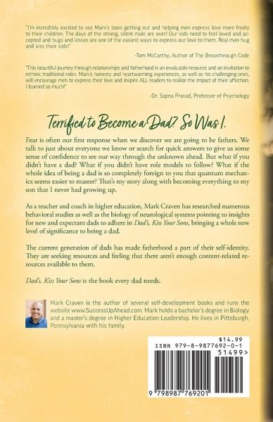 Terrified to Become a Dad? So Was I. Fear is often our first response when we discover we are going to be fathers. We talk to just about everyone we know or search for quick answers to give us some sense of confidence to see our way through the unknown ahead. But what if you didn't have a dad? What if you didn't have role models to follow? What if the whole idea of being a dad is so completely foreign to you that quantum mechanics seems easier to master? That's my story along with becoming everything to my son that I never had growing up. As a teacher and coach in higher education, Mark Craven has researched numerous behavioral studies as well as the biology of neurological systems pointing to insights for new and expectant dads to adhere in Dad's, Kiss Your Sons, bringing a whole new level of significance to being a dad. The current generation of dads has made fatherhood a part of their self-identity. They are seeking resources and feeling that there aren't enough content-related resources available to them. Dad's, Kiss Your Sons is the book every dad needs.