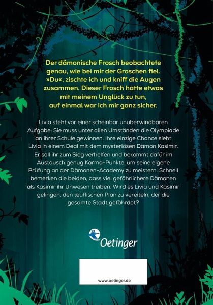 Livia scheint vom Pech verfolgt zu sein. Ihre Eltern haben sich scheiden lassen und ihre Schulnoten sind schlecht. Dann meldet sie ihre verhasste Mathelehrerin auch noch bei der Schulolympiade an, wo sie sich mit den anderen messen muss, um bessere Noten zu bekommen. Außerdem fühlt sie sich beobachtet und sieht an jeder Ecke einen kleinen schwarzen Frosch mit gelben Punkten. Als sie versucht, ihren mysteriösen Verfolger zu stellen, verwandelt sich der kleine Frosch vor ihren Augen in einen blonden Jungen. Er stellt sich als waschechter Dämon namens Kasimir vor. Kasimir treibt viel Unsinn, um Karma-Punkte für seine Dämonenprüfung zu sammeln. Die beiden schmieden einen Plan: Kasimir wird Livias Schulwettbewerb so manipulieren, dass sie gewinnt und er dafür jede Menge Karma-Punkte bekommt. Da merken sie, dass ein finsterer Dämon nicht nur hinter Kasimirs Karma-Punkten her ist, sondern einen bösen Plan ausheckt, der die gesamte Stadt gefährdet. Wird es Livia und Kasimir gelingen, den finsteren Plan des Oberdämons zu vereiteln?