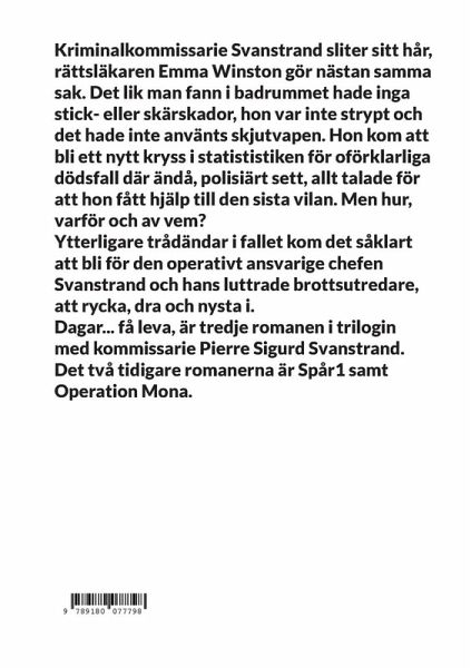 Kriminalkommissarie Svanstrand sliter sitt hår, rättsläkaren Emma Winston gör nästan samma sak. Det lik man hittat i badrummet hade inga sticksår, hon var inte strypt och de hade inte använts skjutvapen. Inga normala sjukdomsbilder kunde man se på rättsläkarstationen i Solna heller. Därför blev hon ett nytt kryss i statistiken. Oförklarligt dödsfall, där ändå allt talade för att hon fått hjälp till den sista vilan. Men hur, varför och av vem? Man finner en del kopplingar till Köpenhamn och den ljusskygga handeln av kvinnor på olika klubbar som hennes man och en kollega hade under högkonjunkturen och skar guld med pennkniv. Hur skall arvet fördelas efter deras företag om någon skulle avlida av kompanjonerna? Många trådändar för Svanstrand och hans utredare att dra i.