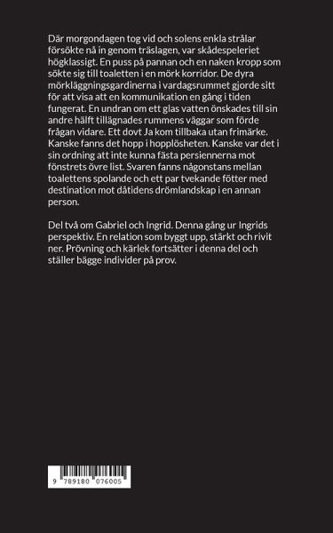 Där morgondagen tog vid och solens enkla strålar försökte nå in genom träslagen, var skådespeleriet högklassigt. En puss på pannan och en naken kropp som sökte sig till toaletten i en mörk korridor. De dyra mörkläggningsgardinerna i vardagsrummet gjorde sitt för att visa att en kommunikation en gång i tiden fungerat. En undran om ett glas vatten önskades till sin andre hälft tillägnades rummens väggar som förde frågan vidare. Ett dovt Ja kom tillbaka utan frimärke. Kanske fanns det hopp i hopplösheten. Kanske var det i sin ordning att inte kunna fästa persiennerna mot fönstrets övre list. Svaren fanns någonstans mellan toalettens spolande och ett par tvekande fötter med destination mot dåtidens drömlandskap i en annan person. Del två om Gabriel och Ingrid. Denna gång ur Ingrids perspektiv. En relation som byggt upp, stärkt och rivit ner. Prövning och kärlek fortsätter i denna del och ställer bägge individer på prov.