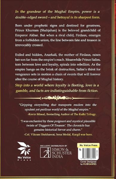 In the grandeur of the Mughal Empire, power is a double-edged sword-and betrayal is its sharpest form. Born under prophetic signs and destined for greatness, Prince Khurram (Shahjahan) is the beloved grandchild of Emperor Akbar. But when a rival child, Firdaus, emerges from a forbidden union, the line between fate and treason is irrevocably crossed. Exiled and hidden, Anarkali, the mother of Firdaus, raises her son far from the empire's reach. Meanwhile Prince Salim, torn between love and loyalty, spirals into rebellion. As the empire hangs on the brink of destruction, Salim's thirst for vengeance sets in motion a chain of events that will forever alter the course of Mughal history.Step into a world where loyalty is fleeting, love is a gamble, and facts are indistinguishable from fiction.