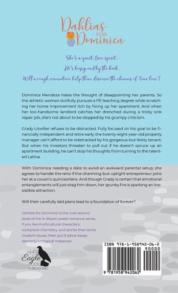 She's a quiet, free spirit. He's bossy and by the book. Will a rough renovation help them discover the charms of true love? Dominica Mendoza hates the thought of disappointing her parents. So the athletic woman dutifully pursues a PE teaching degree while scratching her home improvement itch by fixing up her apartment. And when her too-handsome landlord catches her drenched during a tricky sink repair job, she's not about to be stopped by his grumpy criticism. Grady Litwiller refuses to be distracted. Fully focused on his goal to be financially independent and retire early, the twenty-eight-year-old property manager can't afford to be sidetracked by his gorgeous-but-feisty tenant. But when his investors threaten to pull out if he doesn't spruce up an apartment building, he can't stop his thoughts from turning to the talented Latina. With Dominica needing a date to avoid an awkward parental setup, she agrees to handle the reno if the charming-but-uptight entrepreneur joins her at a cousin's quinceañera. And though Grady is certain that emotional entanglements will just drag him down, her spunky fire is sparking an irresistible attraction. Will their carefully laid plans lead to a foundation of forever? Dahlias for Dominica is the cute second book of the In Bloom sweet romance series. If you like multicultural characters, workplace chemistry, and stories that tackle modern issues, then you'll adore Kasey Kennedy's magical makeover.