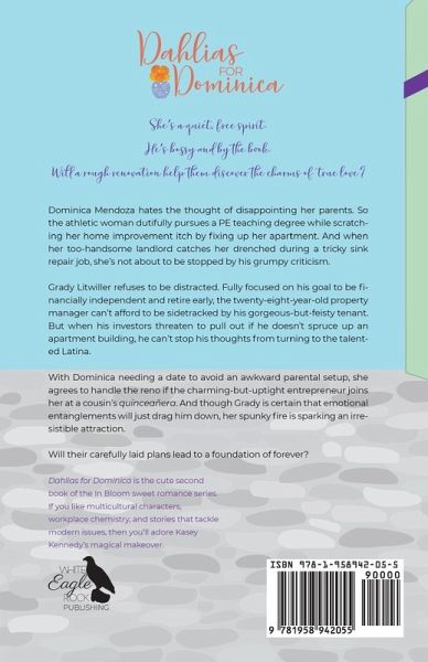 She's a quiet, free spirit. He's bossy and by the book. Will a rough renovation help them discover the charms of true love? Dominica Mendoza hates the thought of disappointing her parents. So the athletic woman dutifully pursues a PE teaching degree while scratching her home improvement itch by fixing up her apartment. And when her too-handsome landlord catches her drenched during a tricky sink repair job, she's not about to be stopped by his grumpy criticism. Grady Litwiller refuses to be distracted. Fully focused on his goal to be financially independent and retire early, the twenty-eight-year-old property manager can't afford to be sidetracked by his gorgeous-but-feisty tenant. But when his investors threaten to pull out if he doesn't spruce up an apartment building, he can't stop his thoughts from turning to the talented Latina. With Dominica needing a date to avoid an awkward parental setup, she agrees to handle the reno if the charming-but-uptight entrepreneur joins her at a cousin's quinceañera. And though Grady is certain that emotional entanglements will just drag him down, her spunky fire is sparking an irresistible attraction. Will their carefully laid plans lead to a foundation of forever? Dahlias for Dominica is the cute second book of the In Bloom sweet romance series. If you like multicultural characters, workplace chemistry, and stories that tackle modern issues, then you'll adore Kasey Kennedy's magical makeover.
