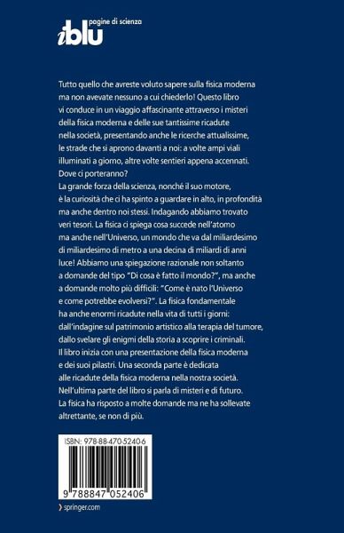 Tutto quello che avreste voluto sapere sulla fisica moderna ma non avevate nessuno a cui chiederlo! Questo libro vi conduce in un viaggio affascinante attraverso i misteri della fisica moderna e delle sue tantissime ricadute nella società, presentando anche le ricerche attualissime, le strade che si aprono davanti a noi: a volte ampi viali illuminati a giorno, altre volte sentieri appena accennati. Dove ci porteranno? La grande forza della scienza, nonché il suo motore, è la curiosità che ci ha spinto a guardare in alto, in profondità ma anche dentro noi stessi. Indagando abbiamo trovato veri tesori. La fisica ci spiega cosa succede nell'atomo ma anche nell'Universo, un mondo che va dal miliardesimo di miliardesimo di metro a una decina di miliardi di anni luce! Abbiamo una spiegazione razionale non soltanto a domande del tipo "Di cosa è fatto il mondo?", ma anche a domande molto più difficili: "Come è nato l'Universo e come potrebbe evolversi?". La fisica fondamentale ha anche enormi ricadute nella vita di tutti i giorni: dall'indagine sul patrimonio artistico alla terapia del tumore, dallo svelare gli enigmi della storia a scoprire i criminali. Il libro inizia con una presentazione della fisica moderna e dei suoi pilastri. Una seconda parte è dedicata alle ricadute della fisica moderna nella nostra società. Nell'ultima parte del libro si parla di misteri e di futuro. La fisica ha risposto a molte domande ma ne ha sollevate altrettante, se non di più.