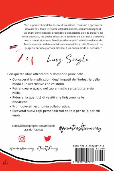 Con questo libro affronterai 5 domande principali:Conoscerai le implicazioni degli impatti dell'industria della moda e le alternative che esistono. Potrai creare spazio nel tuo armadio senza buttare via nulla. Ridurrai la quantità di vestiti che finiscono nelle discariche. Promuoverai l'economia collaborativa. Riceverai nuovi capi personalizzati da te e per te (o per chi vuoi).