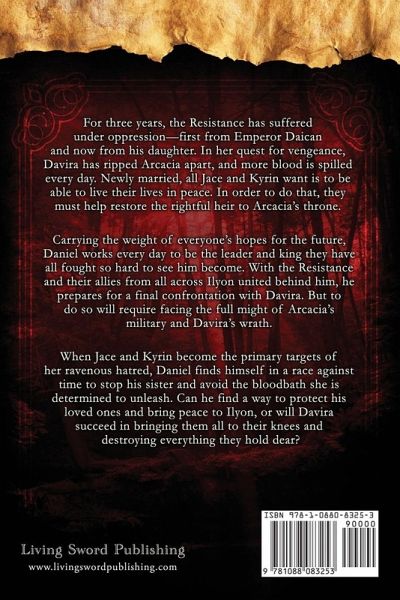 For three years, the Resistance has suffered under oppression-first from Emperor Daican and now from his daughter. In her quest for vengeance, Davira has ripped Arcacia apart, and more blood is spilled every day. Newly married, all Jace and Kyrin want is to be able to live their lives in peace. In order to do that, they must help restore the rightful heir to Arcacia's throne. Carrying the weight of everyone's hopes for the future, Daniel works every day to be the leader and king they have all fought so hard to see him become. With the Resistance and their allies from all across Ilyon united behind him, he prepares for a final confrontation with Davira. But to do so will require facing the full might of Arcacia's military and Davira's wrath. When Jace and Kyrin become the primary targets of her ravenous hatred, Daniel finds himself in a race against time to stop his sister and avoid the bloodbath she is determined to unleash. Can he find a way to protect his loved ones and bring peace to Ilyon, or will Davira succeed in bringing them all to their knees and destroying everything they hold dear?