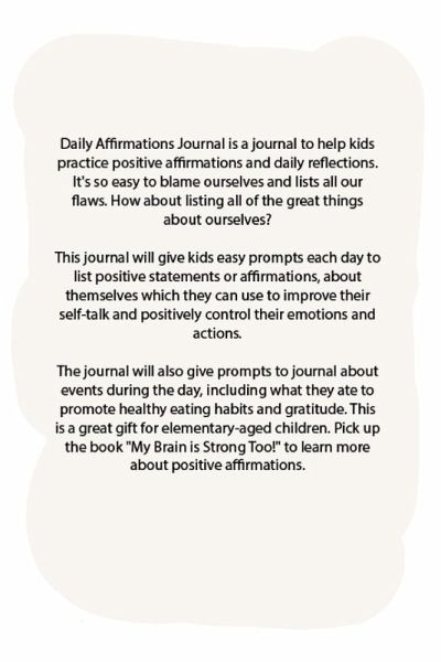 Daily Affirmations Journal is a journal to help kids practice positive affirmations and daily reflections. It's so easy to blame ourselves and lists all our flaws. How about listing all of the great things about ourselves? This journal will give kids easy prompts each day to list positive statements or affirmations, about themselves which they can use to improve their self-talk and positively control their emotions and actions. The journal will also give prompts to journal about events during the day, including what they ate to promote healthy eating habits and gratitude. This is a great gift for elementary-aged children. Pick up the book "My Brain is Strong Too!" to learn more about positive affirmations.