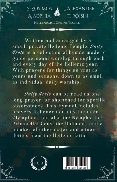Written and arranged by a small, private Hellenic Temple, Daily Arete is a collection of hymns made to guide personal worship through each and every day of the Hellenic year. With prayers for things as vast as years and seasons, down to as small as individual daily worship. Daily Arete can be read as one long prayer, or shortened for specific observances. This Hymnal includes prayers to honor not only the main Olympians, but also the Nymphs, the Primordial Gods, the Daimons, and a number of other major and minor deities from the Hellenic faith.