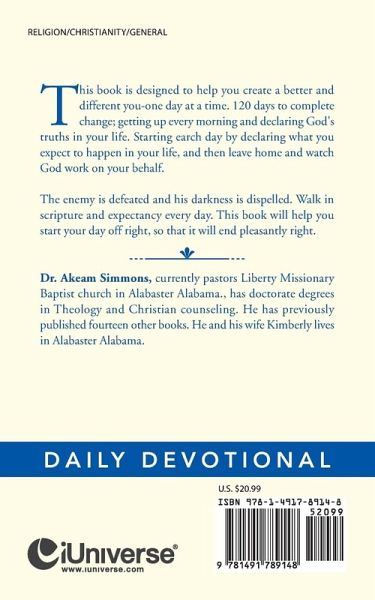 This book is designed to help you create a better and different you-one day at a time. 120 days to complete change; getting up every morning and declaring God's truths in your life. Starting earch day by declaring what you expect to happen in your life, and then leave home and watch God work on your behalf. The enemy is defeated and his darkness is dispelled. Walk in scripture and expectancy every day. This book will help you start your day off right, so that it will end pleasantly right.