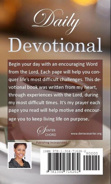Throughout my life I have been through more than I can ever write about. If the enemy had its way, I should have been a mean, bitter woman who hates the world. It was the Holy Spirit who led me to Scripture and sound doctrine to get me where I am today. In spite of life's battles, I've decided to become better instead of bitter. Through this Daily Devotional book, you will read the same scriptures and motivational quotes God gave me during the hardest times in my life. It is my prayer God would bless whatever your hands find to do for the kingdom, in spite of what you've been through, because you are chosen and will never be forgotten. Begin each month writing your prayer request to the Lord. Only read the pages for that month very carefully and mediate and apply what you've learned for that month. At the end of each month, write your prayers of thanksgiving.