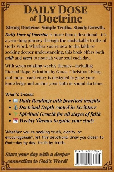Daily Dose of DoctrineStrong Doctrine. Simple Truths. Steady Growth A full year of sound doctrine-one day at a time. Daily Dose of Doctrine is a 365-day devotional rooted in the truth of the Authorized 1611 King James Bible. Written to feed both the babe in Christ and the seasoned believer, each daily entry delivers a simple yet powerful portion of biblical truth-rich in doctrine, saturated with Scripture, and centered on the Lord Jesus Christ. Whether you are new to the faith or seeking to grow deeper in God's Word, this devotional provides:A clear daily Scripture (KJV) A short, doctrinally sound devotion A prayer to help apply the truth And a yearlong journey built on seven repeating weekly themes: Eternal Hope The Need of a Saviour Jesus Christ: The Way Salvation by Grace Through Faith Christian Living & Sanctification The Word of God Sound Doctrine & Discernment With a blend of milk and meat, this devotional is designed to encourage spiritual growth, strengthen biblical understanding, and help believers walk daily in truth and humility. Whether read in the quiet of the morning or revisited at night, Daily Dose of Doctrine will nourish your soul, renew your mind, and point your heart toward the Saviour-day after day. "But speak thou the things which become sound doctrine." -Titus 2:1