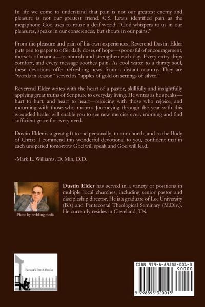 In life we come to understand that pain is not our greatest enemy and pleasure is not our greatest friend. C.S. Lewis identified pain as the megaphone God uses to rouse a deaf world: "God whispers to us in our pleasures, speaks in our consciences, but shouts in our pains." From the pleasure and pain of his own experiences, Reverend Dustin Elder puts pen to paper to offer daily doses of hope-spoonsful of encouragement, morsels of manna-to nourish and strengthen each day. Every entry drips comfort, and every message soothes pain. As cool water to a thirsty soul, these devotions offer refreshing news from a distant country. They are "words in season" served as "apples of gold on settings of silver." Reverend Elder writes with the heart of a pastor, skillfully and insightfully applying great truths of Scripture to everyday living. He writes as he speaks-hurt to hurt, and heart to heart-rejoicing with those who rejoice, and mourning with those who mourn. Journeying through the year with this wounded healer will enable you to see new mercies every morning and find sufficient grace for every need. Dustin Elder is a great gift to me personally, to our church, and to the Body of Christ. I commend this wonderful devotional to you, confident that in each unopened tomorrow God will speak and God will lead. Mark L. Williams, D.Min, D.D.