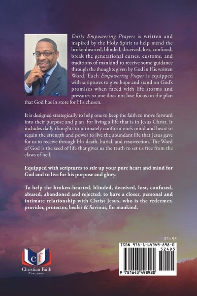 Daily Empowering Prayers is written and inspired by the Holy Spirit to help mend the brokenhearted, blinded, deceived, lost, confused, break the generational curses, customs, and traditions of mankind to receive some guidance through the thoughts given by God in His written Word. Each Empowering Prayer is equipped with scriptures to give hope and stand on God's promises when faced with life storms and pressures so one does not lose focus on the plan that God has in store for His chosen. It is designed strategically to help one to keep the faith to move forward into their purpose and plan for living a life that is in Jesus Christ. It includes daily thoughts to ultimately conform one's mind and heart to regain the strength and power to live the abundant life that Jesus gave for us to receive through His death, burial, and resurrection. The Word of God is the seed of life that gives us the truth to set us free from the claws of hell. Equipped with scriptures to stir up your pure heart and mind for God and to live for his purpose and glory. To help the broken-hearted, blinded, deceived, lost, confused, abused, abandoned and rejected; to have a closer, personal and intimate relationship with Christ Jesus, who is the redeemer, provider, protector, healer & Saviour, for mankind.