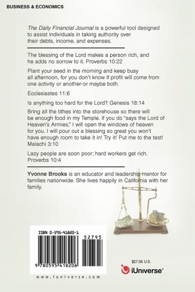 The Daily Financial Journal is a powerful tool designed to assist individuals in taking authority over their debts, income, and expenses. _______________________________________ The blessing of the Lord makes a person rich, and he adds no sorrow to it. Proverbs 10:22 Plant your seed in the morning and keep busy all afternoon, for you don't know if profit will come from one activity or another-or maybe both. Ecclesiastes 11:6 Is anything too hard for the Lord? Genesis 18:14 Bring all the tithes into the storehouse so there will be enough food in my Temple. If you do "says the Lord of Heaven's Armies," I will open the windows of heaven for you. I will pour out a blessing so great you won't have enough room to take it in! Try it! Put me to the test! Malachi 3:10 Lazy people are soon poor; hard workers get rich. Proverbs 10:4 ________________________________________ Yvonne Brooks is an educator and leadership mentor for families nationwide. She lives happily in California with her family.