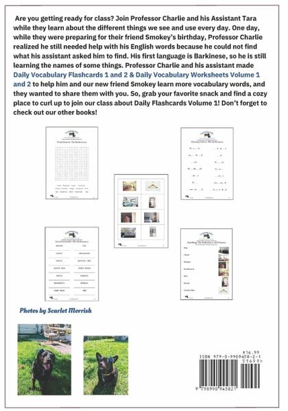 Are you getting ready for class? Join Professor Charlie and his assistant, Tara, while they learn about the different things we see and use every day. One day, while they were preparing for their friend Smokey's birthday, Professor Charlie realized he still needed help with his English words because he could not find what his assistant asked him to find. His first language is Barkinese, so he is still learning the names of some things. Professor Charlie and his assistant made Daily Vocabulary Flashcards 1 and 2 & Daily Vocabulary Worksheets Volume 1 and 2 to help him and our new friend Smokey learn more vocabulary words, and they wanted to share them with you. So, grab your favorite snack and find a cozy place to curl up to join our class about Daily Flashcards Volume 2! Don't forget to check out our other books!