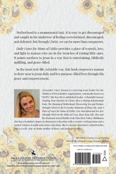 Motherhood is a monumental task. It is easy to get discouraged and caught in the undertow of feeling overwhelmed, discouraged, and defeated. But through Christ, we can be more than conquerors. Daily Grace for Moms of Littles provides a place of warmth, love, and light to mamas who are in the trenches of raising little ones. It points mothers to Jesus in a way that is entertaining, biblically uplifting, and grace-filled. In the most real-life, relatable way, this book empowers mamas to draw near to Jesus daily and live purpose-filled lives through His grace and empowerment. Endorsements ""If you feel overlooked, isolated, weary, and plain worn out as you are navigating mom-life, this book is for you. These pages are laced with encouragement and aim to help draw you closer to the source of strength: Jesus. Alexandra's raw, vulnerable stories are comforting and encouraging to those of us walking alongside her in the trenches of motherhood." -Brianna Barrett Writer, photographer, and mother "Eighteen years ago, I was a new mom. I had looked forward to that time of life when I could spend all day, every day, at home with my new little one. There were many things I needed during those mothering-of-littles years, but the one I'm most certain I needed the most was grace. Daily Grace for Moms of Littles speaks into those formative years of newborns, toddlers, and preschoolers-those years when we lack sleep, alone time in the bathroom, and grace for ourselves. Alexandra weaves a beautiful picture of God's truth through this devotional with Scripture, encouraging anecdotes, and soul-filling steps of faith. Daily Grace For Moms of Littles is a beautiful work that encourages every mom of littles to give themselves grace in the hard work of motherhood and to seek the never-ending grace of God daily." -Nichole J. Suvar Founder of The Intentional Life Collective, Author of Numbering Our Days, and mother "Daily Grace for Moms of Littles is indeed for moms with young children; yet as a mom of six and three who are grown, I'd say this devotional is for all moms. Alex weaves a roadmap of hope, biblical wisdom, faithful steps, and prayer throughout the book. She elevates the role of motherhood and family life as the most God-ordained work we have. I will most definitely share this devotional with my friends." -Sarah Green Writer and mother